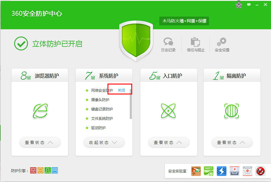 单击未开启的防护旁的“开启”;即可开启相应防护,小编的是已经开启的,所以显示的就是关闭