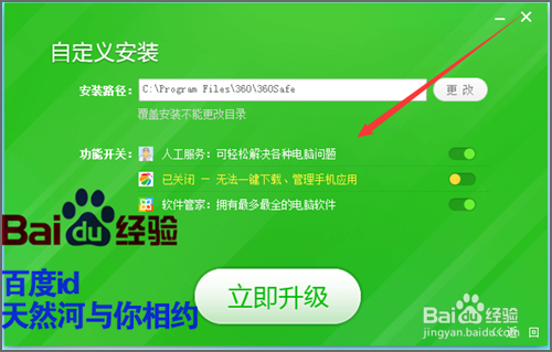 当点击了自定义安装之后,在它弹出的自定义安装的界面中,可以看到在列表中有一个功能开关。如果我们不需要哪一种的话,可以在它的后面进行一个关闭。选择好之后点击下面的立即升级。