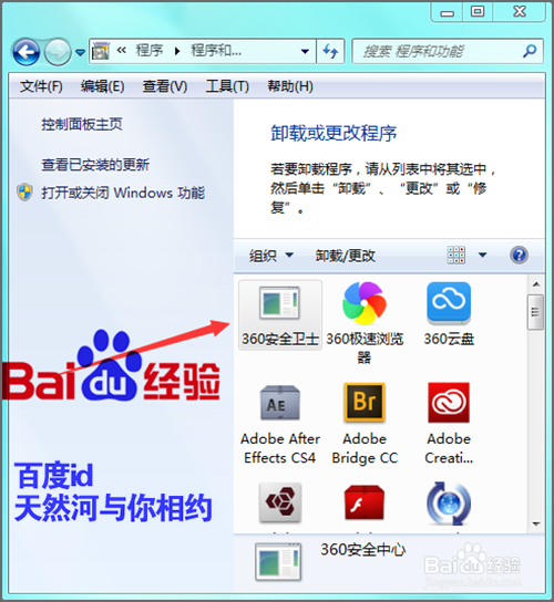 接着在打开的程序面板中找到安全卫士的图标,在它的图标上点击右键卸载/更改。