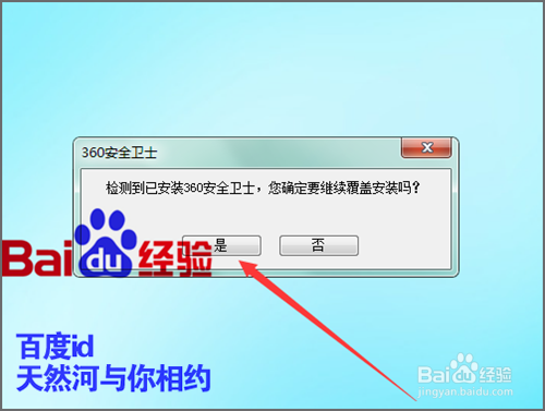 在接下来的安装中,它会弹出一个提示的界面:检测到已安装安全卫士,您确定要覆盖安装吗?因为我们之前的安全卫士没有进行卸载。在重新安装这个程序的时候,它会有提示。我们点击是。