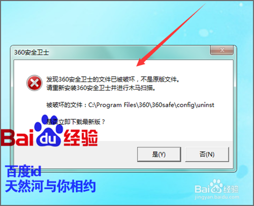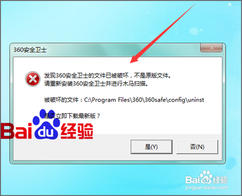 在这个弹出的界面中,我们可以看到它有这样的提示:发现360安全卫士的文件已经被损坏,不是原版文件。请得新安装360安全卫士并进行木马扫描。然后问是否要下载最新版?