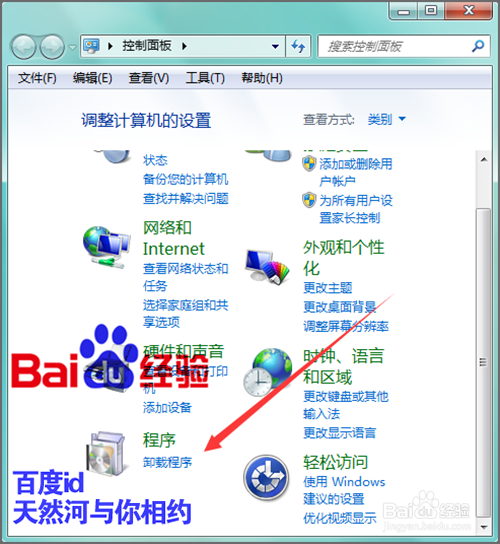 我们需要在程序中进行卸载它的程序,在任务栏中的开始菜单中点击一下,在它的列表中找到并点击一下控制面板。接着在弹出的控制面板中界面中找到程序--卸载程序。把它的查看方式改为类别,这样更容易找。
