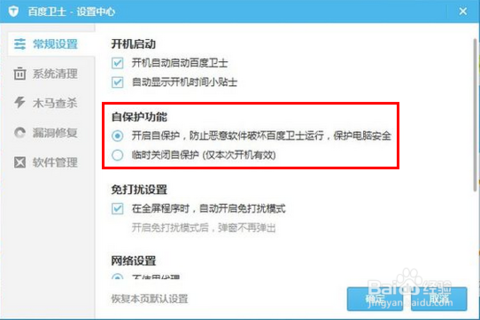 实际上,百度卫士卸载后,是可能在进行自动安装的,为了防止百度卫士自动安装,我们可以在卸载百度卫士之前,关闭把自保护功能,如下图所示: