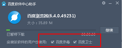 如果大家使用百度下载软件之后,选择的是“极速下载”,那么大家在安装过程中(其实这时还是在下载软件,只是百度利用自身技术提高下载速度),百度会推广百度卫士软件,大家记得把前面的勾去掉。如下图所示: