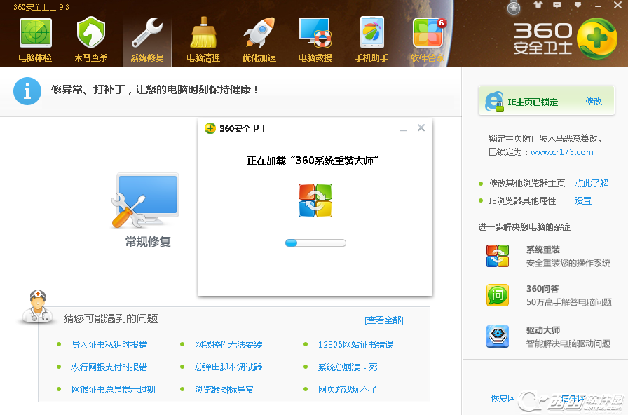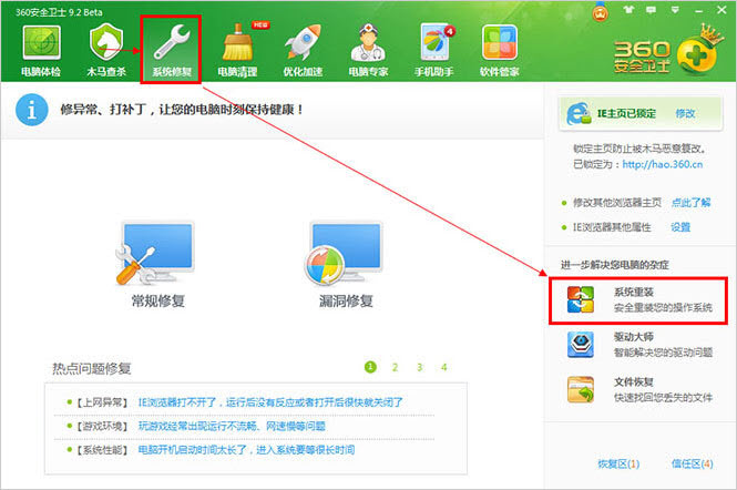 1、打开360安全卫士,系统修复选项页,看右边的系统重装