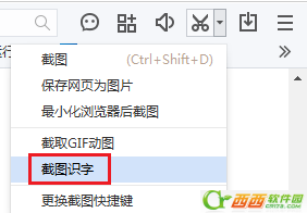 2、打开百度浏览器,点击右上角剪刀图标右侧的倒三角,下拉菜单选择截图识字