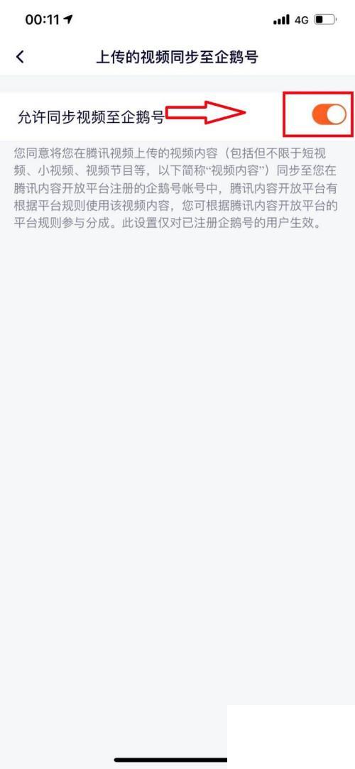 5、如图,在此页面我们点击开启允许同步视频至企鹅号即可。