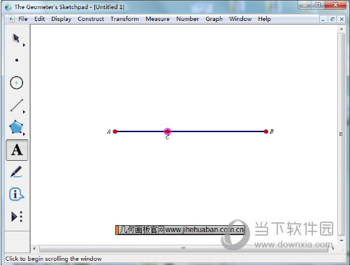 此处以线段AB上的点C为动画目标,所以在几何画板中先用线段工具作一条线段,然后用文本工具标上端点A、B,然后用点工具在线段AB上作任意一点C,如下图所示。