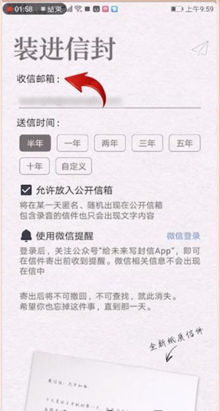 你在给未来写封信app上写了一封信之后需要填写你自己真实的邮箱,到了时间给未来写封信app就会将你当时写的新通过填写的邮箱地址发送给你。那么,给未来写封信怎么填收件邮箱呢?需要的朋友可以一起来了解一下。